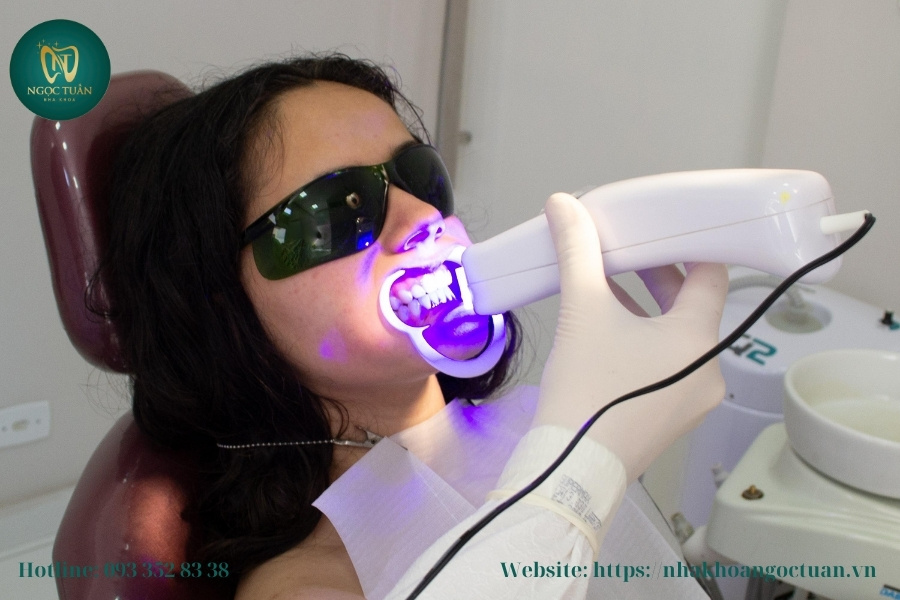 Sau khi gel tẩy trắng được bôi đều, thiết bị Laser hoặc LED sẽ được sử dụng để kích hoạt hoạt chất trong gel. Ánh sáng từ các thiết bị này giúp đẩy nhanh quá trình oxy hóa, khiến các phân tử màu bị phá vỡ nhanh chóng, từ đó làm trắng răng hiệu quả chỉ sau một buổi điều trị. Quá trình này được thực hiện dưới sự giám sát chặt chẽ của bác sĩ, đảm bảo kiểm soát nhiệt độ và thời gian chiếu sáng, từ đó giảm thiểu nguy cơ kích ứng hay ê buốt, mang lại kết quả làm trắng đều và tự nhiên.