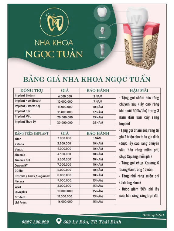 Nha Khoa Ngọc Tuấn còn cam kết chi phí minh bạch và hợp lý. Khách hàng được tư vấn chi tiết về các loại trụ Implant, giá cả cụ thể và những yếu tố ảnh hưởng đến chi phí điều trị. Chính sự minh bạch này giúp chúng tôi chiếm trọn niềm tin từ khách hàng, trở thành lựa chọn hàng đầu tại khu vực Thái Bình.